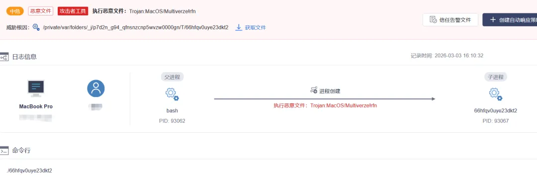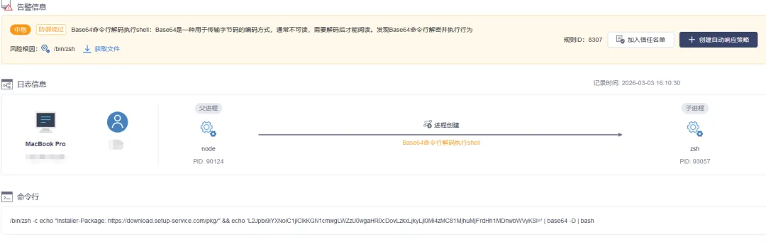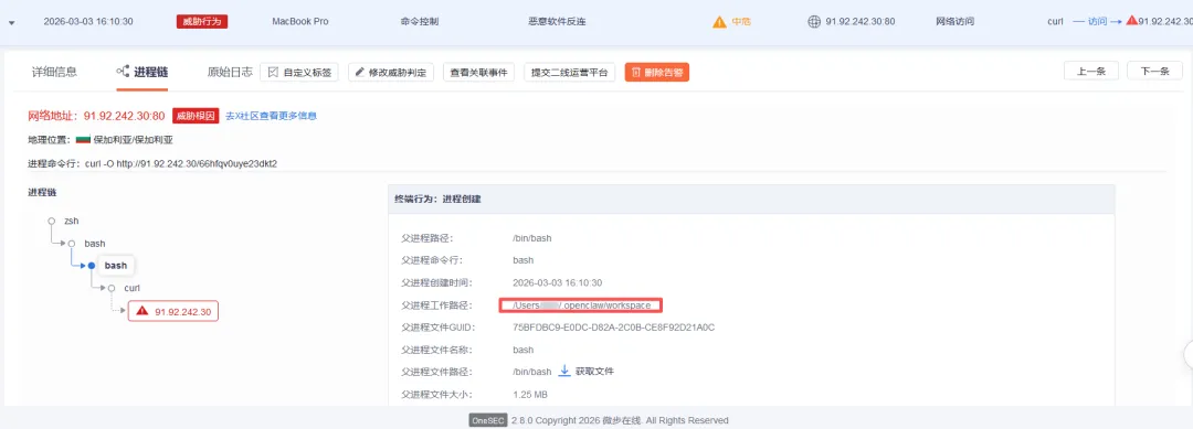The Skill triggered a download of secondary malware from an attacker-controlled server. OneSEC traced the download path back to the originating OpenClaw process, establishing the chain of custody needed to attribute the intrusion.