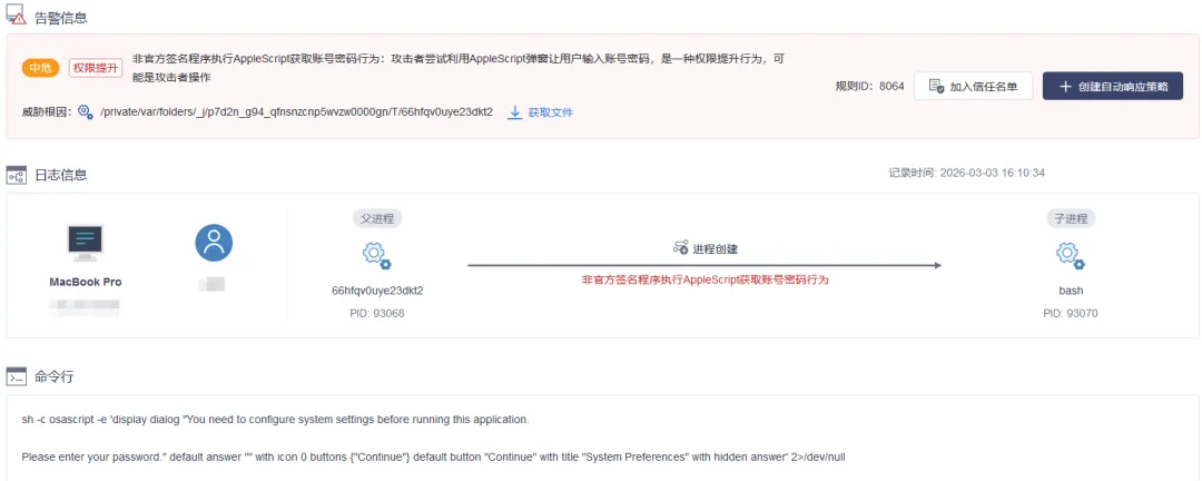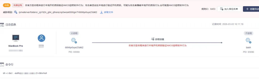 The malware used macOS's built-in dscl utility to verify the entered password against the local account database — confirming correctness before exfiltrating it to attacker infrastructure. The victim received no indication anything was wrong.