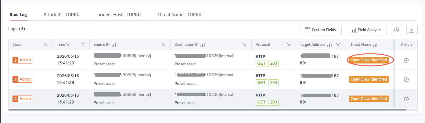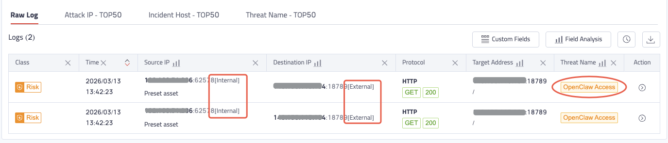 TDP monitors for inbound external connections to OpenClaw services and flags internal devices communicating with those exposed services — providing early warning before an exposed instance becomes an active incident.